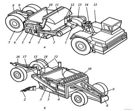 Самоходный скрепер представляет собой единую конструкцию с индивидуальной энергетической установкой, обеспечивающей передвижение машины и работу всех агрегатов, в том числе и управление рабочими органами.