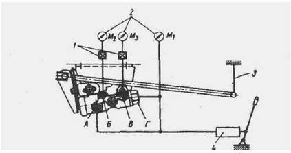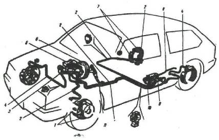 1 – гальмовий механізм переднього колеса; 2 – трубопровід контуру «ліве переднє – праве заднє гальма»; 3 – головний циліндр гідропривода гальм; 4 – трубопровід контуру «правий передній – лівий задній гальма»;