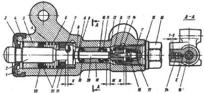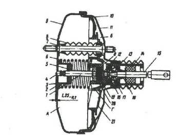 1 – шток; 2 – ущільньнююче кільце головного циліндра; 3 – чашка корпуса підсилювача; 4 – регулювальний гвинт; 5 – ущільнювач штока; 6 – поворотна пружина діафрагми; 7 – шпилька підсилювача; 8 – ущільнюючий чохол; 9 – корпус підсилювача; 10 – діафрагма; 11 – кришка корпуса підсилювача; 12 – поршень; 13 – захисний чохол корпуса клапана; 14 – повітряний фільтр; 15 – штовхальник; 16 – поворотна пружина штовхальника; 17 – пружина клапана; 18 – клапан; 19 – втулка корпуса клапана; 20 – буфер штока; 21 – корпус клапана; А – вакуумна камера; Б – атмосферна камера; В, Г – канали