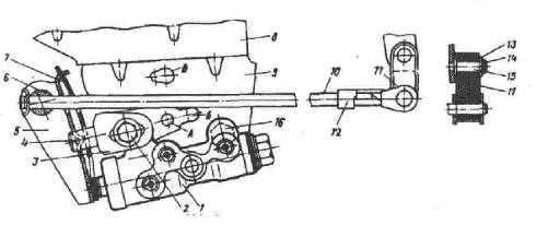 Регулятор тиску 1 кріпиться до кронштейну 9 двома болтами 2 і 16. При цьому передній болт 2 одночасно кріпить вільчатий кронштейн З важеля 5 приводу регулятора тиску. На пальці цього важеля шарнірно штифтом 4 кріпиться двоплечий важіль 5. Його верхнє плече через вісь 6 зв'язане з пружним важелем 10, інший кінець якого через сережку 11 шарнірно з'єднується з кронштейном важеля задньої підвіски. Кронштейн 3 разом із важелем 5 за рахунок овальних отворів під болт кріплення можна переміщати щодо регулятора тиску. Цим самим регулюється зусилля, з котрим важіль 5 діє на поршень регулятора.