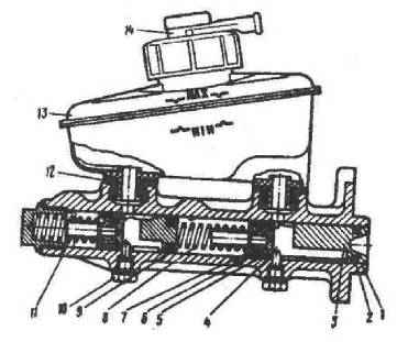 На корпусі головного циліндра кріпиться бачок 13 (рис. 6), у заливній горловині якого встановлений датчик 14 аварійного рівня гальмової рідини. Ущільнюючі кільця 5 високого тиску використовуються з заднього колісного циліндра.