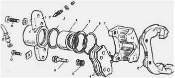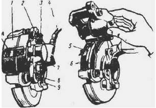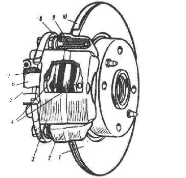 Дисковий, з автоматичним регулюванням зазора між колодками і диском, із плаваючою скобою. Скоба утворюється супортом 3 (рис. 7) і колісним циліндром 5, що стягнуті болтами. Рухлива скоба кріпиться болтами до направляючих пальців 9, що встановлені в отвори направляючої 2 колодки. У ці отвори закладається мастило. Між пальцями і направляючою колодок встановлені гумові чохли 8. До пазів направляючої піджаті пружинами гальмові колодки 4. У порожнині колісного циліндра встановлений поршень 6 зущільнюючим кільцем 7. За рахунок пружності цього кільця підтримується оптимальний зазор між колодками і диском 1, поверхня якого захищена кожухом 10.