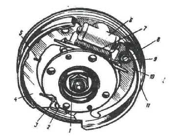 1 – гайка кріплення ступиці; 2 – ступиця колеса; 3 – нижня стяжна пружина колодок; 4 – гальмова колодка; 5 – направляюча пружина; 6 – колісний циліндр; 7 – верхня стяжна пружина; 8 – розжимна планка; 9 – палець важеля приводу стояночного гальма; 10 – важіль приводу стояночного гальма; 11 – гальмовий щит