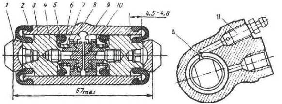 при запресуванні поршня в циліндр необхідно витримати розмір 4,5–4,8 мм і 67 мм (максимально) для вільної посадки гальмового барабана; перед установкою деталей у корпус циліндра їх густо змащують гальмовою рідиною.
