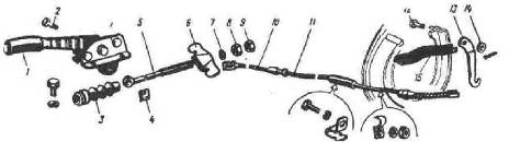 Зняття. Встановлюють важіль 1 (див. рис. 10) стояночного гальма в крайнє нижнє положення, від'єднують наконечники тросів 10 від важелів 13 ручного приводу колодок і від урівнювача 6, для чого відвертають із тяги 5 контргайку 9 і регулювальну гайку 8, потім знімають шайбу 7 і урівнювач 6. Вийнявши шплінт І вісь 12, знімають шайбу 14, від'єднують наконечник троса від важеля 13 стояночного гальма і роз'ємну планку 15 колодок. Відвертають гайки кріплення кронштейну важеля стояночного гальма до підлоги кузова І знімають важіль 1 у зборі з кронштейном.