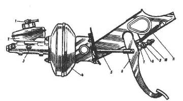 1 – датчик аварійного рівня рідини; 2 – бачок; 3 – головний циліндр; 4 – вакуумний підсилювач; 5 – штовхальник; 6 – педаль гальма; 7 – буфер вимикача стоп-сигналу; 8,9 – гайки кріплення стоп-сигналу; 10 – вимикач стоп-сигналу; 11 – поворотна пружина педалі
