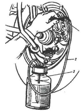 Перед видаленням повітря з гальмової системи переконуються в герметичності усіх вузлів приводу гальм і їхніх з'єднань, очищають кришку і поверхню навколо кришки бачка, заповнюють бачок рідиною «Нева» або «Томб» до мітки «МАХ». Потім ретельно очищають штуцера для видалення повітря і знімають з них захисні ковпачки. Не рекомендується застосовувати рідину, злиту із системи для заповнення бачка, тому що вона насичена повітрям, має багато вологи і, можливо, забруднена.