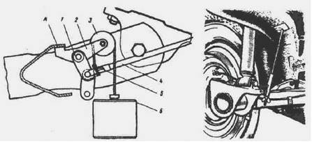 перевіряють повний хід важеля стояночного гальма, що повинний відповідати 4–5 щигликам собачки об сектор; потім затягують контргайку.