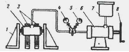 1 – упори поршнів; 2 – випробуваний циліндр; 3 – кронштейн циліндра; 4 – манометр низького тиску; 5 – манометр високого тиску; 6 – циліндр для створення тиску; 7 – сосуд; 8 – маховик
