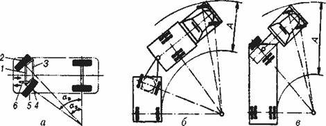 Рис.1.1 Схема повороту автомобіля (а), автопоїзда в складі тягача з причепом (б) та тягача з напівпричепом (в): 1 - балка; 2,4 - відповідно правий та лівий поворотні важелі; 3,6 - відповідно поперечна й подовжня тяги; 5 - поворотна цапфа; А - ширина смуги руху