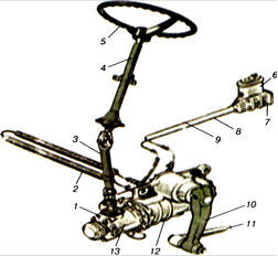 Розташування й взаємодію деталей рульового керування, що не має підсилювача, можна розглянути на спрощеній схемі рис.2. Тут рульовий механізм складається з рульового колеса З, рульового вала 2 та рульового механізму 1, утвореної зчепленням черв'ячної шестірні (черв'яка) із зубчастим сектором, на вал якого кріпиться сошка 9 рульового приводу. Сошка та решта деталей рульового керування - подовжня тяга 8, поворотний важіль 7, поворотні важелі 5 лівої та правої поворотних цапф, поперечна тяга 6 - складають рульовий привод.