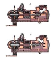 Робота перепускного клапана при спрацьовуванні вбудованого в нього запобіжного клапана здійснюється аналогічним чином. Відкриваючись, кульковий клапан пропускає невеликий потік масла в бачок через радіальні отвори в перепускному клапані. При цьому тиск на правий торець перепускного клапана падає, оскільки потік масла, що йде через кульковий клапан, обмежений отвором Б. Клапан у цьому випадку, переміщуючись управо, відкриває вихід у бачок основної частини масла, що перепускається. Регулювання запобіжного клапана повинно здійснюватися тільки застосуванням регулювальних шайб 32, що підкладаються під сідло клапана 31. Для запобігання шуму і зносу деталей насоса при підвищенні частоти обертання колінчастого вала двигуна передбачений колектор 24. Він примусово направляє масло, що зливається перепускним клапаном у внутрішню порожнину корпусу насоса і забезпечує при цьому підвищений тиск у зонах всмоктування. Це необхідно для уникнення надмірного розрідження і появи кавітації. Спеціально підібраний змінний перетин внутрішньої порожнини колектора до і після отворів у ньому сприяє тому, що потоком масла в колекторі захоплюється масло з бачка гідросистеми.