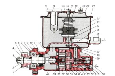 1 - шестірня приводу; 2 - гайка кріплення шестірні; 3 - шплінт; 4, 15 - шайби; 5 - вал насоса; 6 - сегментна шпонка; 7, 10 - упорні кільця; 8 - кульковий підшипник; 9 - масловідгінне кільце; 11 - манжета; 12 - голчастий підшипник; 13 - кришка заливної горловини; 14 - заливний фільтр; 16 - болт; 17, 36, 39 - ущільнювальні кільця; 18 - труба фільтра; 19 - запобіжний клапан; 20 - кришка; 21, 28 - ущільнювальні прокладки; 22 - бачок; 23 - фільтруючий елемент; 24 - колектор; 25 - трубка бачка; 26 - штуцер; 27 - прокладка колектора; 29 - кришка насоса; 30 - пружина перепускного клапана; 31 - сідло запобіжного клапана; 32 - регулювальні шайби; 33 - перепускний клапан у зборі із запобіжним клапаном; 34 - розподільний диск; 35 - пластина насоса; 37 - статор; 38 - ротор; 40 - корпус насоса; А, Б - дросельні отвори; В - порожнина нагнітання; Г - радіальні отвори; І - з системи; II - в систему