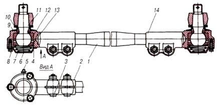 Рис.2.9 Поперечна рульова тяга: 1 - поперечна тяга; 2, 14 - наконечники; 3 - болт кріплення наконечника; 4 - ущільнювальна прокладка; 5 - маслянка; 6 - кришка; 7 - пружина; 8 - болт кріплення кришки; 9 - захисна накладка; 10 - обойма накладки; 11 - кульовий палець; 12 - верхній вкладиш; 13 - нижній вкладиш