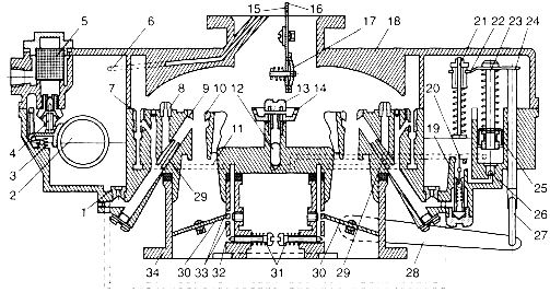 Карбюратор К-88А. На восьмициліндровому двигуні автомобіля ЗИЛ-130 установлено карбюратор К-88А (рис. 1.1.), що має дві змішувальні камери, кожна з яких живить чотири циліндри. Поплавцева камера, її корпус 18 з повітряною заслінкою 16, економайзер і прискорювальний насос – спільні деталі для обох камер карбюратора.