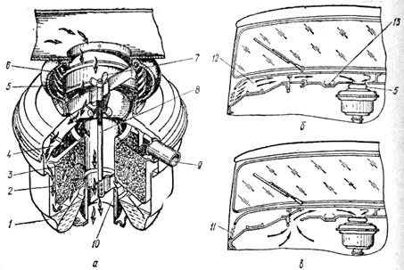 Повітряний фільтр інерційно-масляного типу ВМ-16 двигуна автомобіля ЗИЛ-130 (рис 1.3., а) складається з корпуса 1, у нижню частину якого залита олія до заданого рівня – таке ж, що й у піддоні картера. У центрі корпуса встановлений повітряний патрубок 10 із тримачем 8 і смушковою гайкою 7 для кріплення кришки фільтра. Над оливою знаходиться відбивач 2, а над ним – фільтруючий елемент 3 із кришкою 4, набраний з капронових чи металевих ниток, змочених оливою. Обойма фільтруючого елемента кріпиться в корпусі з зазором для проходу повітря до оливної ванни. Кришка гумовим перехідним патрубком 5 з розширювальною пружиною 6 з'єднується з повітряним каналом 12, до якого повітря надходить через забірники 11. У каналі встановлена заслінка 13, керування якою виведене в кабіну водія. При закритій заслінці непрогріте повітря надходить у прийомний патрубок через забірники (рис. 1.3. б), а при відкритій – з-під капотного простору (рис. 1.3., в), де воно підігрівається від зіткнення з нагрітими частинами двигуна, що поліпшує сумішоутворення в карбюраторі.