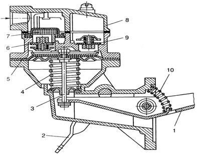 Паливопідкачувальний насос призначається для подавання палива з бака в поплавцеву камеру карбюратора. Найбільш поширені паливопідкачувальні насоси діафрагмового типу (рис. 1.4.). Після того, як ексцентрик розподільного вала двигуна натиснув на зовнішній кінець важеля 1 насоса, діафрагма 5 штоком 3 відтягується вниз. У порожнині над діафрагмою створюється розрідження, під дією якого відкриваються впускні клапани 6. Паливо з бака, пройшовши крізь сітчастий фільтр 7, заповнює порожнину над діафрагмою [4].