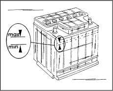 2. Уровень электролита должен находиться между отметками на внешней стороне корпуса аккумуляторной батареи (иллюстр.). Доливать батарею необходимо только дистиллированной водой.