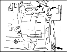 3. Отверните болты крепления генератора от натяжной планки и от нижней опоры (стрелки на иллюстрации).