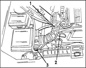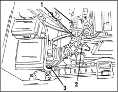 2. Снимите детали, показанные на иллюстр. Это шланг всасывания воздуха (1) между корпусом дроссельной заслонки и корпусом воздушного фильтра. Расстыкуйте штекерное соединение кабеля (2) от датчика температуры всасываемого воздуха и (3) измерителя массы всасываемого воздуха.