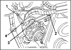 4. Снимите генератор в соответствии с иллюстр. Для этого отверните сначала болты крепления (1) и (2), а затем болты (3) и (4). После этого ослабляется нижний болт крепления генератора. Отклоните генератор в сторону.