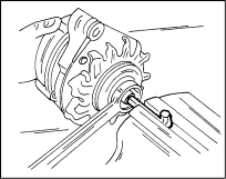 2. Отверните с вала ротора гайку и снимите с вала шкив и вентилятор с дистанционной шайбой. Удерживать вал от проворачивания можно накинув на шкив старый ремень и зажав его в тисках. Можно также вставить в отверстие вала торцевой ключ и отвернуть гайку накидным ключом, как показано на иллюстр. Для снятия шкива применяется двух- или трехзахватный съемник.