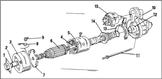 Схема сборки стартера Bosch: 1 - крышка; 2 - втулка; 3 - корпус подшипника; 4 - обмотка возбуждения; 5 - корпус; 6 - якорь; 7 - плита щеткодержателей; 8 - щеткодержатель; 9 - пружина; 10 - задняя крышка; 11 - стяжной болт; 12 - втулка; 13 - рычаг привода; 14 - шестерня; 15 - тяговый электромагнит