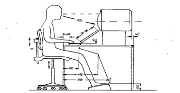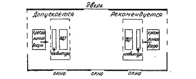 - монитор должен устанавливаться так, чтобы не было бликов и ДСП смотрел на него под углом 90°, а не сбоку; не ближе 70см от экрана и 1,2м от стенок дисплея;