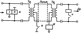Гальванический способ (рис. 1.4) характеризуется тем, что цепи передачи сигналов даже при наличии на линии трансформаторов имеют гальваническую связь. Данный способ передачи сигнализации нашел применение на сельских телефонных сетях при связи сельских АТС с ручными телефонными станциями системы ЦБ, а также для ручных станций системы МБ при связи с АТС, когда станции МБ не оборудованы источниками электропитания напряжением 24 В. Недостатком способа является то, что сигналы управления проходят по обоим проводам линии в одном направлении и поэтому оказывают значительное индуктивное влияние на соседние цепи.