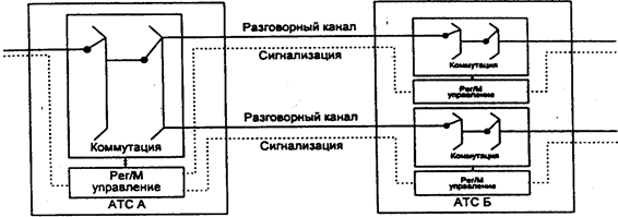 Система сигнализации второго класса - сигнализация по выделенному сигнальному каналу (ВСК) - обычно ассоциируется с этим классом станций. Сигнальная информация проходит по тому же пути, что и соответствующий разговор, но они разделены внутри станции. Это представлено на рисунке 1.5, где разговорные телефонные цепи (обозначенные сплошными линиями) организуются коммутационным блоком, а сигнальная информация (обозначенная пунктирными линиями) передается и принимается управляющими устройствами станции.