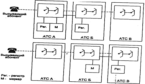 Следующий этап развития коммутационных станций показан на рисунке 1.5. Здесь уже отдельные ступени искания шаговых станций заменяются коммутационными блоками, а для установления соединений и разъединений вводятся специальные управляющие устройства (регистры и маркеры), отделенные от коммутационных приборов. Такая технология позволяет добиться большей гибкости в управлении вызовами и является более экономичной.
