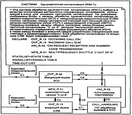 Такой неравноправный подход к описаниям систем сигнализации различных классов объясняется след)тощими причинами. Детальные спецификации систем общеканальной сигнализации, включающие SDL-диаграммы, структуры данных, временные параметры сигналов, сценарии и т.п., разрабатываются и совершенствуются специалистами Исследовательской комиссии 11 Международного консультативного комитета по телеграфии и телефонии (МККТТ), преобразованного в настоящее время в Сектор стандартизации электросвязи Международного союза электросвязи (в английской аббревиатуре ITU-T), и регулярно публикуются в цветных книгах ITU-T, в частности, рекомендации Q.700 в выпусках Желтой, Красной и Голубой книг МККТТ (1981, 1985 и 1989 гг.) и Белой книги ITU-T(1993 г.). Эти спецификации могут быть доступны любознательному читателю наряду с другими книгами по общеканальной сигнализации [121,124]. В то же время SDL-диаграммы, таблицы тайм-аутов, сценарии обмена сигналов и т.п. для специфических российских систем сигнализации по телефонным каналам и ВСК, а также для уникальных процедур определения номера вызывающего абонента (АОН) создавались автором и его коллегами для собственных разработок программно-управляемой коммутационной техники, практически нигде не публиковались, и лишь резко усилившийся в последние годы интерес российских и зарубежных связистов к этой проблематике заставил автора задуматься о целесообразности написания этой книги.