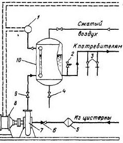Для автоматизации подачи воды к потребителям устанавливают пневмоцистерну (гидрофор), представляющую собой герметический резервуар, в верхней части которого находится сжатый воздух, а в нижнее – вода. Подключающиеся к трубопроводу системы водоснабжения потребители получают воду, вытесняемую из пневмоцистерны под давление сжатого воздуха. Когда давление воздуха в пневмоцистерне снизится до заданного минимального значения, автоматически включается подкачивающий насос и пополняет ее водой до тех пор, пока даление воздуха не достигнет заданного максимального значения. После этого насос автоматически отключается и вода к потребителям вновь подается под давлением сжатого воздуха.