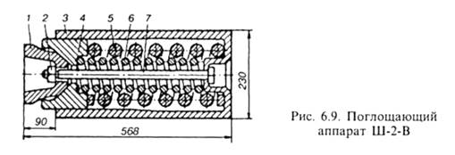 Аппарат Ш-2-В имеет литой корпус 3, три штампованных фрикционных клина 4,штампованный нажимной конус 1, наружная 5 и внутренняя 6 пружины, стяжной болт 7 с гайкой 2. Масса аппарата 134 кг