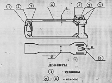 Снятые детали осматривают и обмеряют шаблонами. Исправные детали без трещин, изломов и с износами не более нормы. Для аппарата Ш-2-В толщина стенки корпуса должна быть не менее 18 мм при капитальном и не менее 16 мм при деповском ремонте.