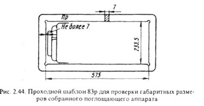 После сборки до постановки гайки стяжного болта выход нажимного конуса должен быть не менее 80 мм при расстоянии между конусом и шайбой не менее 4 мм. Отремонтированный и собранный поглощающий аппарат проверяют шаблоном с размерами 575х233,5 мм. При этом зазор между шаблоном и аппаратом по высоте не должен превышать 7 мм. После проверки аппарата и постановки гайки стяжного болта над гайкой расклёпывается для предупреждения самопроизвольного свинчивания гайки в эксплуатации.