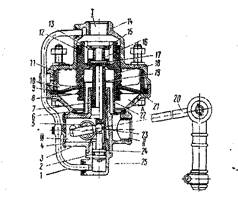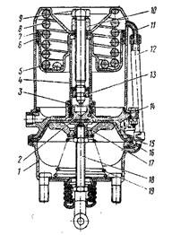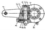 Разжимной кулак 12 вращается в кронштейне 10, прикрепленном к суппорту болтами. На этом кронштейне устанавливается тормозная камера. На конце вала разжимного кулака установлен регулировочный рычаг 14 червячного типа, соединенный со штоком тормозной камеры при помощи вилки и пальца. Щиток, прикрепленный болтами к суппорту, защищает тормозной механизм от грязи.