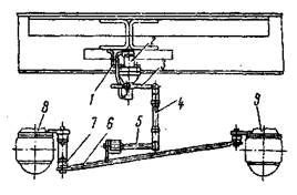 Пневматические тормозные приводы тягача и прицепа соединяют три магистрали: магистраль однопроводного привода, питающая и управляющая (тормозная) магистрали двухпроводного привода. На седельных тягачах соединительные головки 38 и 39 находятся на концах трех гибких шлангов указанных магистралей, закрепленных на поддерживающей штанге. На бортовых автомобилях головки 38 и 39 установлены на задней поперечине рамы.