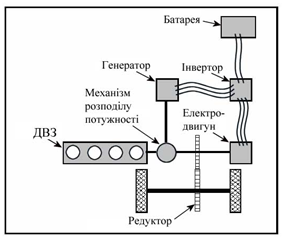 У послідовній схемі кінематичні зв'язки між ДВЗ і ведучими колесами принципово виключаються. Оскільки при цьому ДВЗ не може передавати момент до ведучих коліс, то, мабуть, потужність, передана в буферний накопичувач, повинна бути не менше, ніж середня потужність, необхідна для руху АТЗ, а потужність й електромагнітний момент тягового електропривода повинні дорівнювати максимальній потужності й максимальному моменту рушіїв.