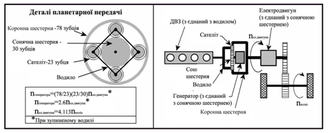Інший варіант паралельної схеми (рисунок 1.2, б) полягає у використанні механічного (від ДВЗ) і електромеханічного (від мотор-генератора, акумулятора через інвертор і тяговий електродвигун) каналів підведення моменту до різних ведучих коліс. Застосовуються й змішані кінематичні схеми (рисунок 1.2, в), у яких ДВЗ і мотор-генератор "працюють" на планетарну передачу (система СПЛІТ). У змішаній схемі потік потужності від двигунів до ведучих коліс розділяється: вал ДВЗ і вал електродвигуна – генератора з'єднані з роздільними входами планетарного редуктора (таку схему іноді називають "двопотоковою"). Крім того, вихідний вал планетарного редуктора з'єднаний з валом тягового електродвигуна. Така схема при відносно невеликих потужностях генератора й тягового електродвигуна дозволяє ефективно управляти потоками потужності й стабілізувати режим роботи ДВЗ. Саме за змішаною схемою виконана більшість тягово-силових установок сучасних комерційних легкових гібридних автомобілів.