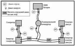 Варіанти послідовної схеми наведені на рисунку 1.1. Застосування послідовної схеми комбінованої енергетичної установки дозволяє забезпечити роботу теплового двигуна на тому режимі, що має мінімальні значення витрати палива й викидів шкідливих речовин, причому в ідеальному випадку, можна здійснити повністю стаціонарний режим роботи двигуна. Тяговий електропривід у даній схемі повинен забезпечувати весь діапазон зміни потужності, необхідної для даних умов руху.