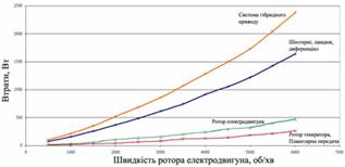 Випробування системи комбінованого приводу показало, що зв'язані з коробкою передач втрати тертя, є суттєвими. Ці втрати складають приблизно 2,4 кВт при швидкості обертання ротора електродвигуна 6000 об/хв. Переважні втрати, приблизно 1,6 кВт, пов'язані з головною передачею й ланцюгом двигуна, у той час як електродвигун, коробка розподілу потужності, і генератор привели до втрат приблизно рівних 0,8 кВт. Втрати зубчастої передачі насамперед пов'язані з оливою, що рухається в межах кожуха двигуна, й оливою, що рухається через генератор і електродвигун, щоб забезпечити необхідне змащування й видалення зайвої високої температури. Ці втрати, які наведені в підсумку в таблиці 5.1, були визначені з мастильними матеріалами при кімнатній температурі (при 25°C). Випробування також показали, що повні втрати зменшилися приблизно на 20 %, коли температура мастильних матеріалів збільшилася з 270 С до 800 С. Це зауваження вказує, що повні втрати для гібридної системи електроприводу рівні приблизно 1,9 кВт при температурі мастильних матеріалів 800 С.