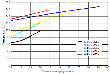 Таблиця 4.12 показує оцінку максимальної потужності за дослідними даними. Залежність температури від часу при різних крутних моментах і механічних навантаженнях зображено на рисунку 4.18.