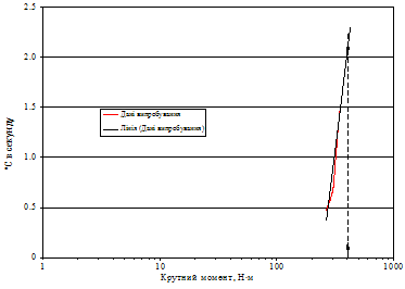 Рисунок 4.19 показує залежність швидкості зміни температури від крутного моменту. Спроектована точка – це точка із координатами 400 Н∙м і 2,1 0 С/с. Якщо температура електродвигуна 40 0 С , то для досягнення критичної температури необхідно 62 с((170-40)/2,1). Якщо обмотка електродвигуна гаряча і її температура 160 0 С, то для виконання тієї ж операції необхідно 4,8 с при максимальному навантаженні ((170-160)/2,1).
