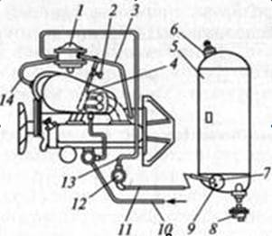 СГ под избытком давления из баллона 5 поступает через расходные вентили 7или 9 по трубопроводу 11 в газовый фильтр 12. Из фильтра очищенный газ по трубопроводу 13 поступает в двухступенчатый редуктор 1, в испарителе которого происходит одновременное испарение СГ и понижение его давления до 0,10...0,15 МПа. Для испарения газа используется нагретая жидкость системы охлаждения двигателя, которая поступает в испаритель из головки цилиндров через шланг 3 и сливается из него через шланг 14 в трубопровод отопителя кузова. Из редуктора 7 газ по шлангу через регулировочный винт 2 поступает в смесительное устройство 4 и через форсунки - в карбюратор-смеситель, где приготавливается горючая смесь, необходимая для данного режима работы двигателя.