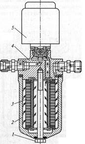 1 - стяжной болт; 2 - стакан; 3 - фильтрующий элемент; 4 - корпус; 5 - электромагнитный клапан.
