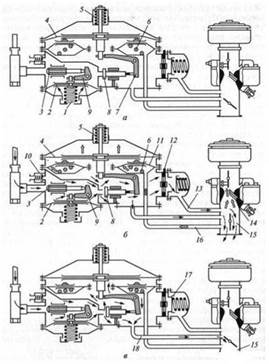 а - при неработающем двигателе; б - при нагрузочном режиме двигателя; в - на холостом ходу; 1, 5, 6 - пружины; 2 - мембрана первой ступени; 3 - клапан первой ступени; 4 - мембрана второй ступени; 7 - двуплечий рычаг второй ступени; 8 - клапан второй ступени; 9 - двуплечий рычаг первой ступени; 10 - предохранительный клапан; 11 - разгрузочное устройство; 12 - дозирующее устройство; 13, 16, 18 - соединительные газовые трубки; 14 - карбюратор-смеситель; 15 - впускной газопровод; 17 - обратный клапан.
