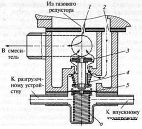 Дозирующе-экономайзерное устройство. Дозирование газа осуществляется в дозирующе-экономайзерном устройстве. Оно позволяет регулировать качество горючей смеси в соответствии с режимами работы двигателя. Подача газа регулируется таким образом, чтобы на частичных нагрузках двигатель работал на обедненных смесях, позволяющих получить наилучшую экономичность и минимальную токсичность отработавших газов. При полном открытии дроссельных заслонок (в режиме максимальной мощности двигателя) горючая смесь при помощи экономайзерного устройства обогащается.