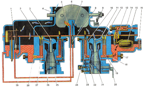 1 - ускорительный насос; 2 - главный воздушный жиклер вторичной камеры; 3 - малый диффузор вторичной камеры; 4 - балансировочный канал; 5 - распылитель экономайзера; 6 - воздушная заслонка; 7 - распылитель ускорительного насоса; 8 - нагнетательный (выпускной) клапан; 9 - кулисный механизм воздушной заслонки; 10 - воздушный жиклер холостого хода; 11 - малый диффузор первичной камеры; 12 - главный воздушный жиклер первичной камеры; 13 - топливный клапан; 14 - топливный фильтр; 15 - поплавок; 16 - смотровое окно; 17 - сливная пробка; 18 - главный топливный жиклер первичной камеры; 19 - эмульсионная трубка первичной камеры; 20 - рычаг привода дроссельных заслонок; 21 - дроссельная заслонка первичной камеры; 22 - переходное отверстие холостого хода; 23 - винт регулировки качества смеси; 24 - топливный жиклер холостого хода 25 - дроссельная заслонка вторичной камеры; 26 - большой диффузор; 27 - эмульсионная трубка вторичной камеры; 28 - главный топливный жиклер вторичной камеры; 29 - обратный (впускной) клапан.