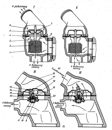 а - жидкостный термостат (двигатель автомобиля ГАЗ-24); б - термостат с твердым наполнителем (двигатель автомобиля ЗИЛ-130);